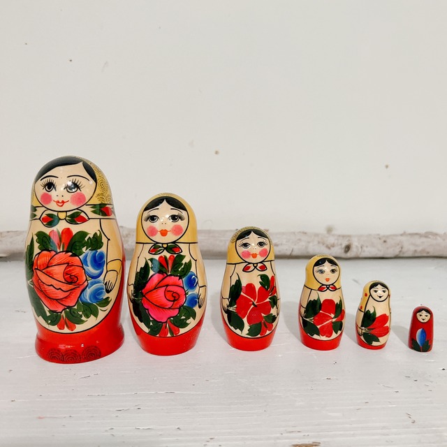 商品説明 ロシアの伝統工芸、マトリョーシカ人形です。 赤を基調に、果実や草花を描いた「ホフロマ柄」を模したデザイン。 華やかでありながら素朴さも感じられる、ロシアらしいあたたかみのある絵付けが魅力です。 セット内容:5体組 サイズ:一番大きな人形 高さ 約10.5cm made in Russia