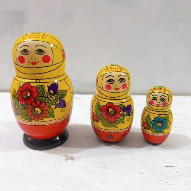 にやけたお顔の宇宙飛行士君 頭のCCCP(シーシーシーピー)は、ソビエト社会主義共和国連邦(USSR)のロシア語表記による略称です。 キリル文字表記では「Союз Совецких Сотсиалистических Республик」で、その頭文字をとったのが「CCCP」。 ロシアでは「エセセセール」と発音されます。 癒ししかありません(笑) 可愛らしいフォルムが3つも! 独特の塗料でちょっと木目が透過し、味のある色合わせとなります。 元気いっぱいに、だけ、どこかこけしの様なお顔が本当に癒し系。 日々の疲れを癒してくれます。 作家のタマラさんはセミョーノフ様式の中でも重鎮で セミョーノフの伝統を受け継ぎ、後世に伝えながらも時代に合わせた 新しい作品に取り組む先駆者です。 セミョーノフ様式を伝える後継者の方々やお弟子さんの作る同じようなデザインも沢山ありますが 当店のものはタマラさんのサイン入りです。 多くのセミョーノフの描き手の中でも特に引き算の素晴らしいお顔だと、私は思っています。 作家:タマラ・コレヴァ 産地:ロシア・セミョーノフ ニス:ぴかぴかニスあり 高さ:約12cm