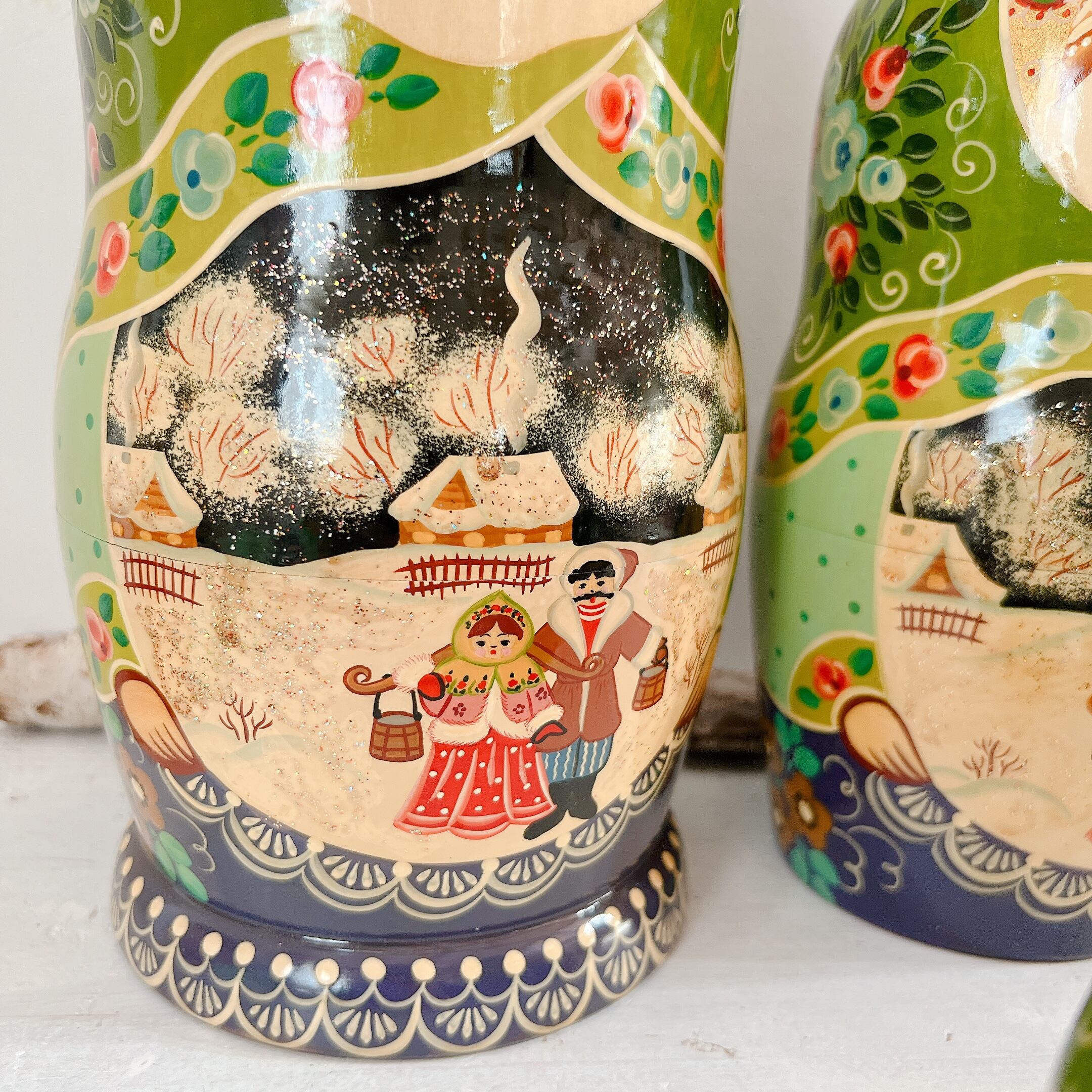 ロシアの美しい冬景色を描いた、華やかなマトリョーシカ。