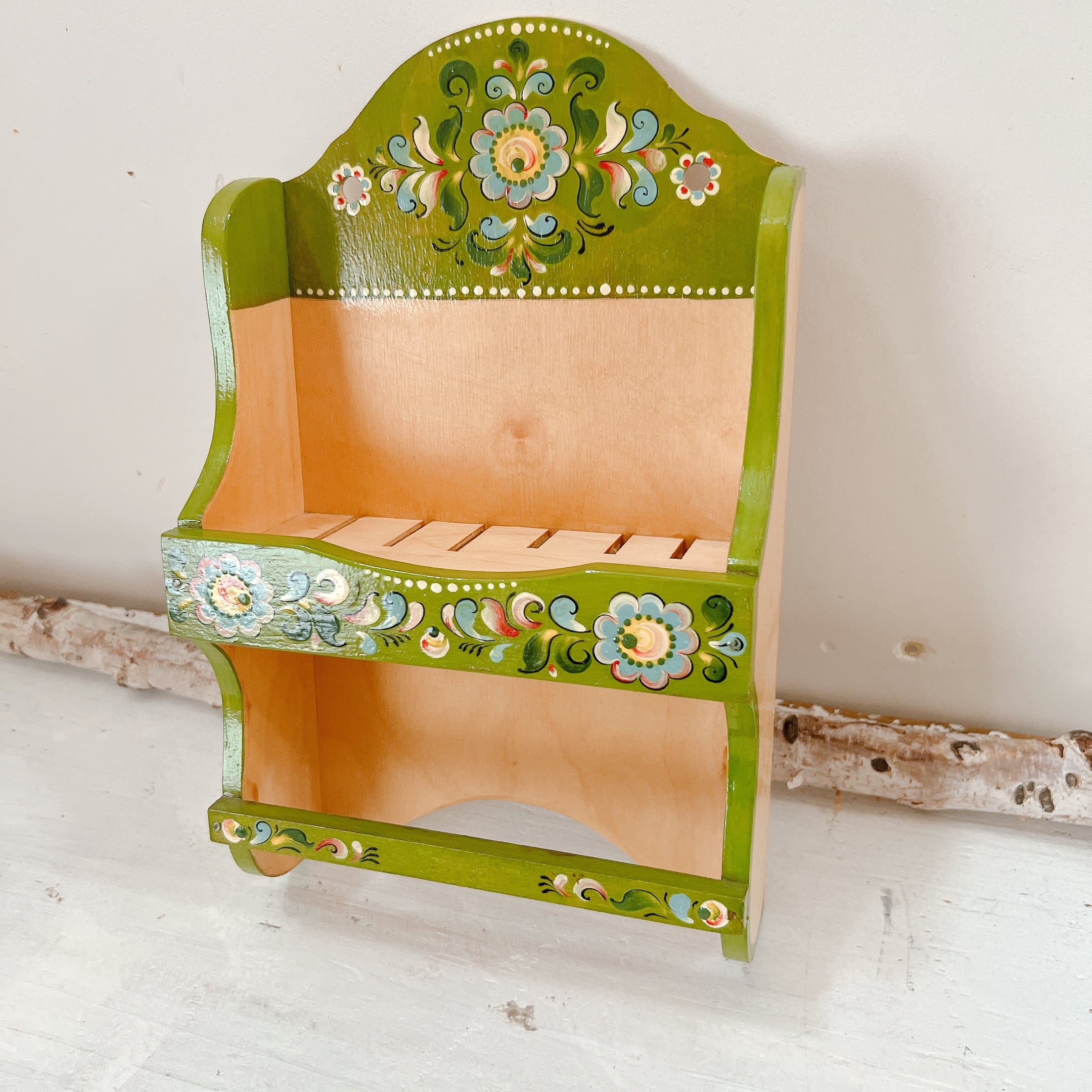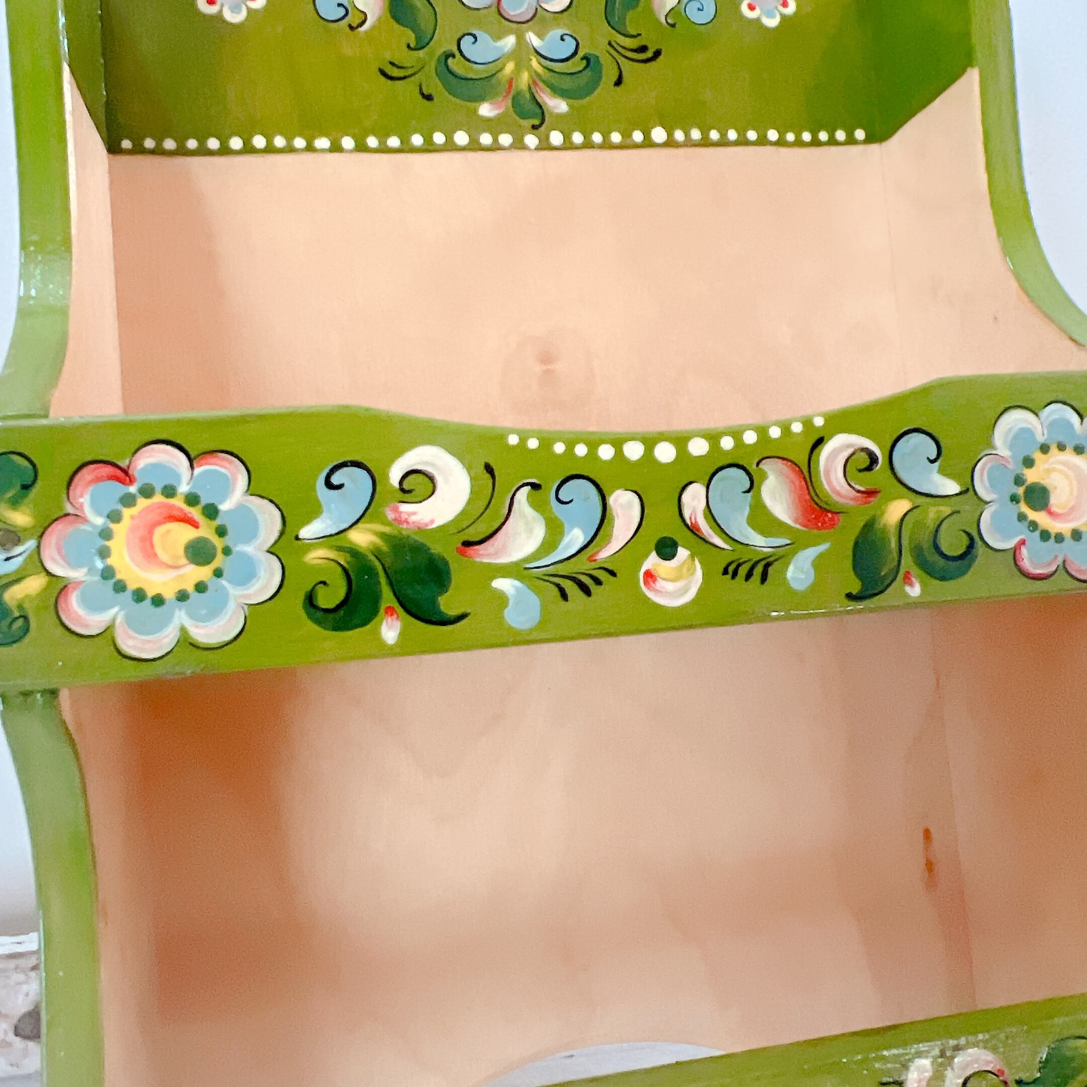伝統的な草花模様が鮮やかなグリーンに手描きされ、温かみのあるフォークアート調の雰囲気を楽しめます。