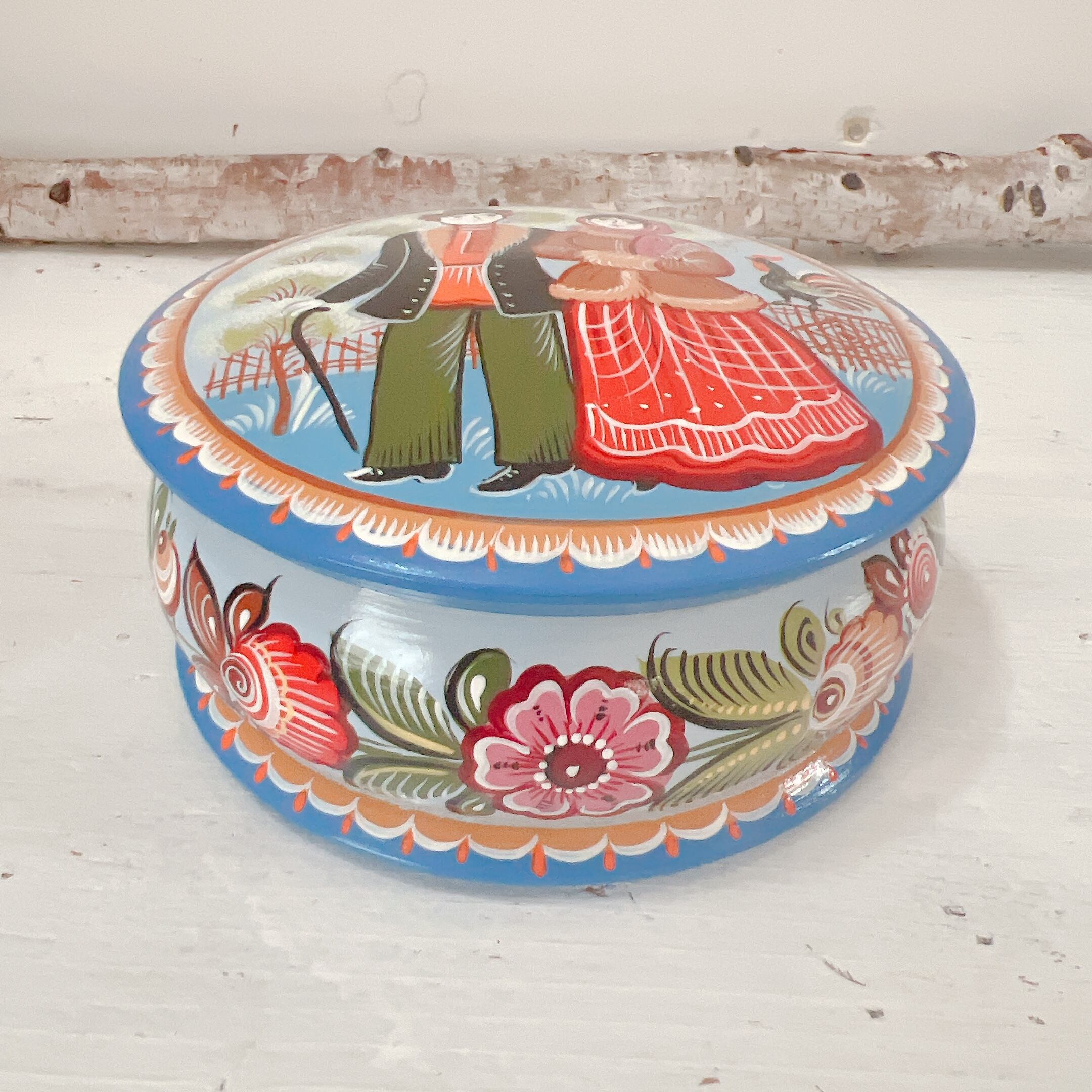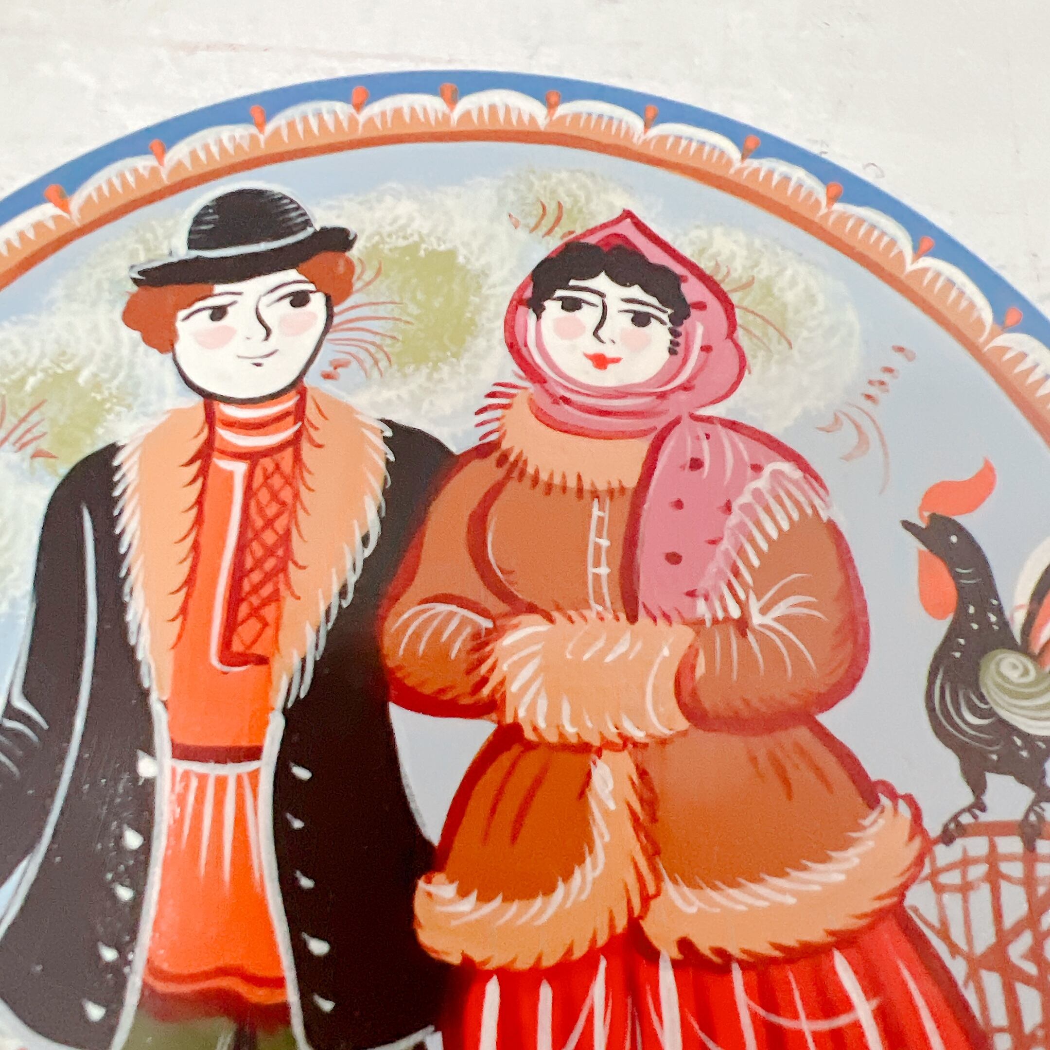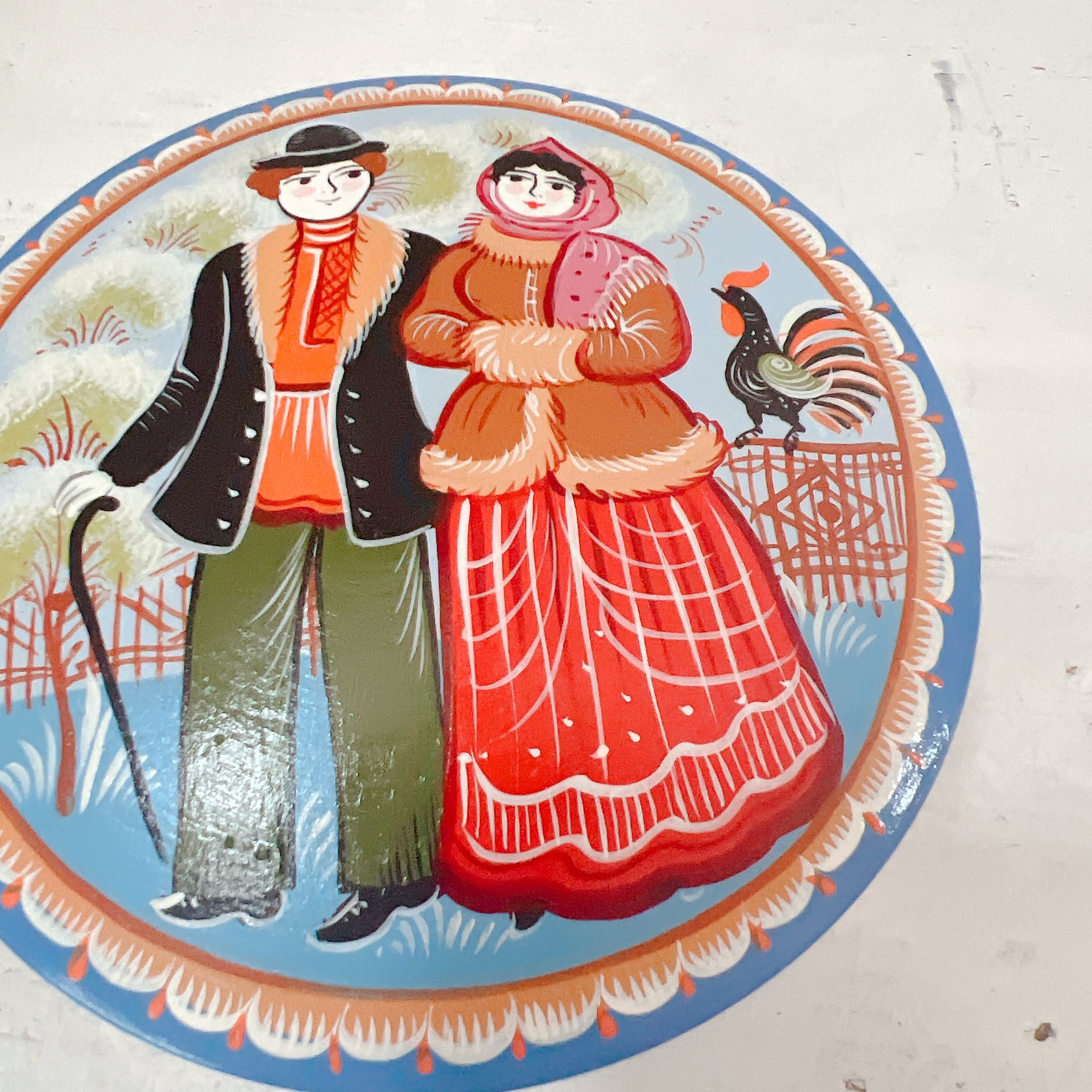 ふたには「Зимняя прогулка(冬の散歩)」と題された情景が描かれ、民族衣装をまとった男女が冬のひとときを楽しむ姿が表現されています。