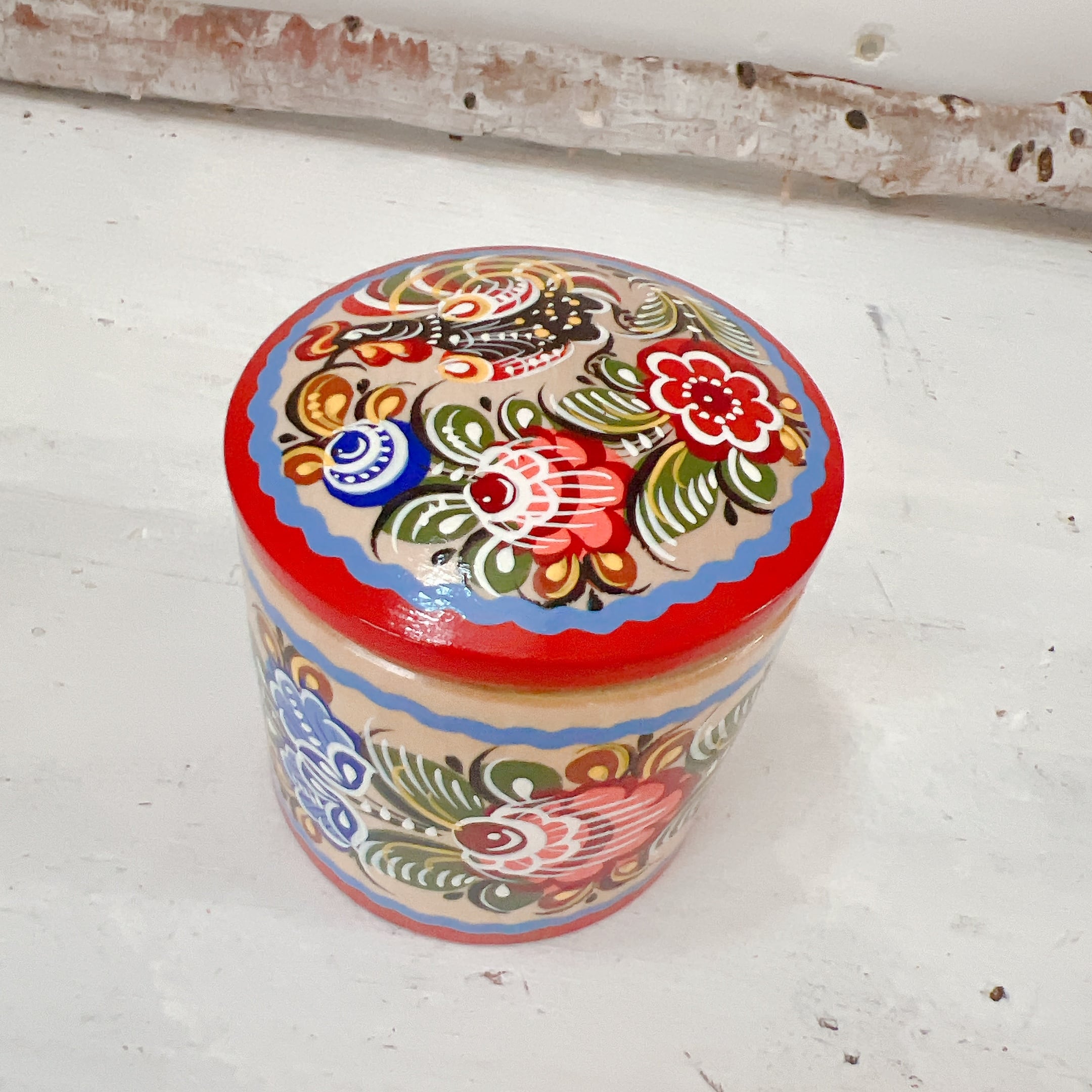 美しい白木に描かれたカラフルな花たちが生き生きとしています。