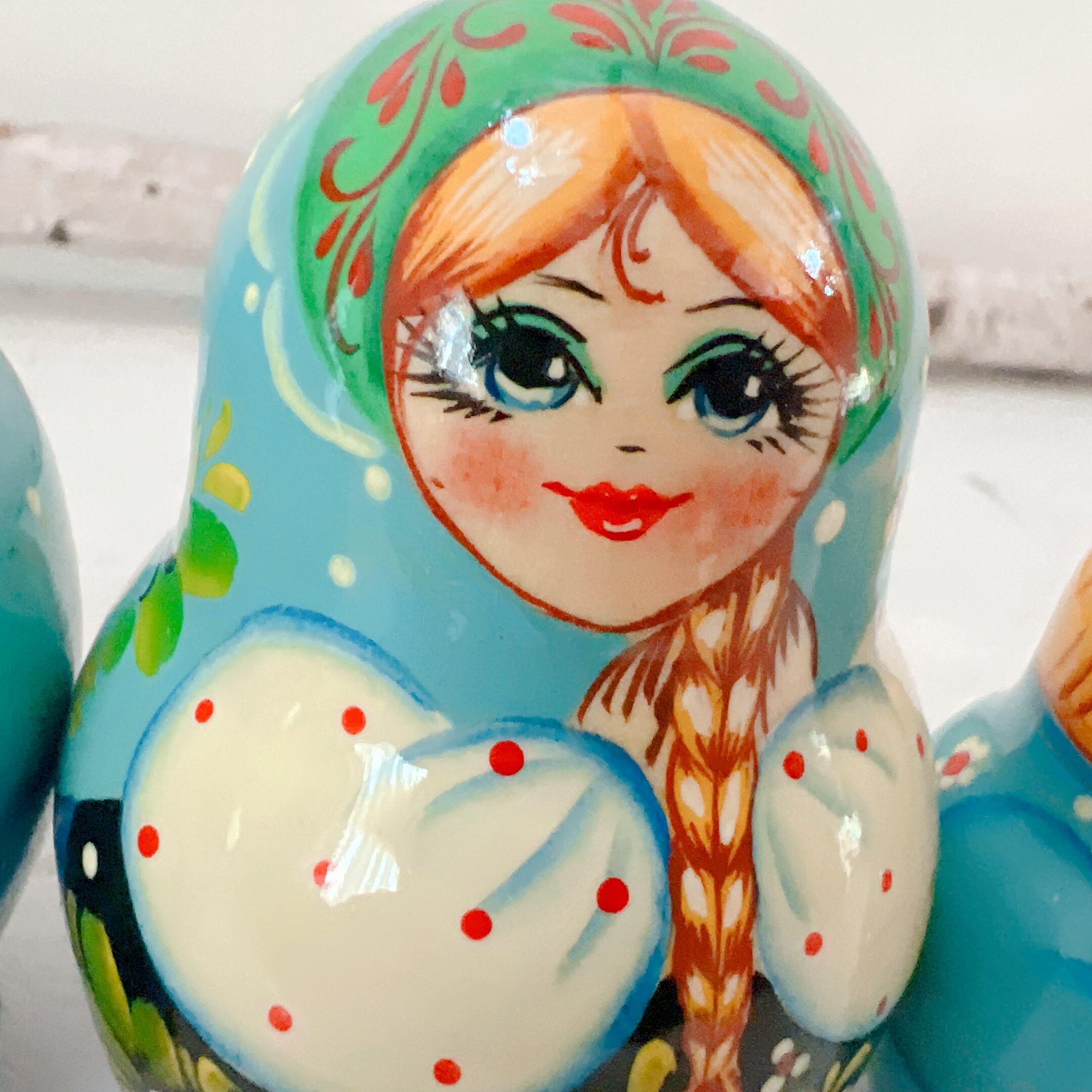 鮮やかなブルーが目を引く、手描きのマトリョーシカ5体セットです。