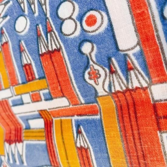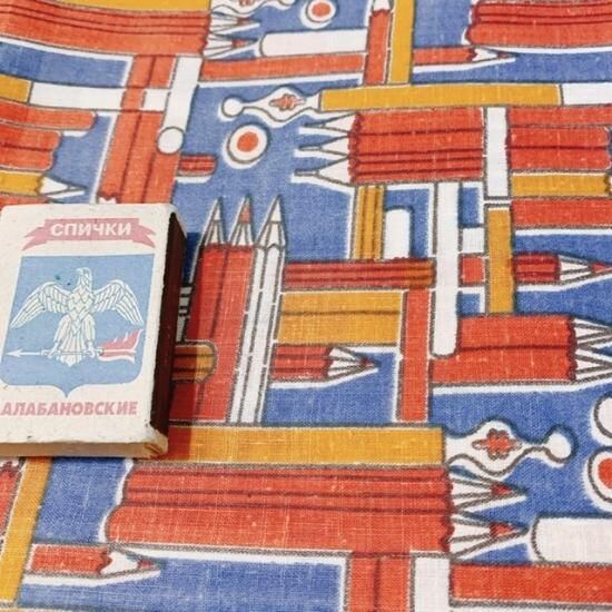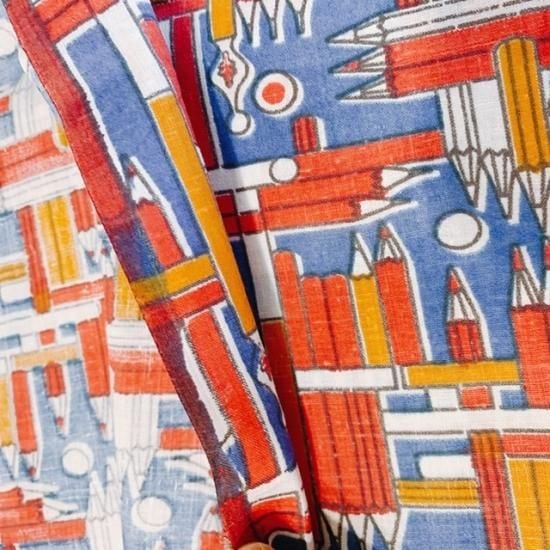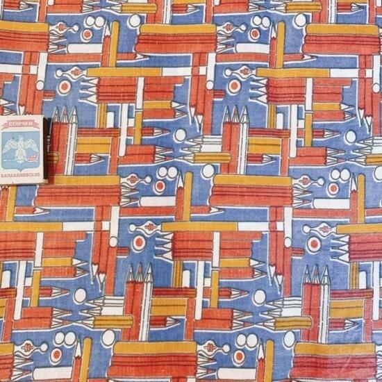 :42: 幅76cm×50cmカット 『鉛筆と万年筆』 赤色系ロシアの昔の布 デッドストック ソビエトデザイン
