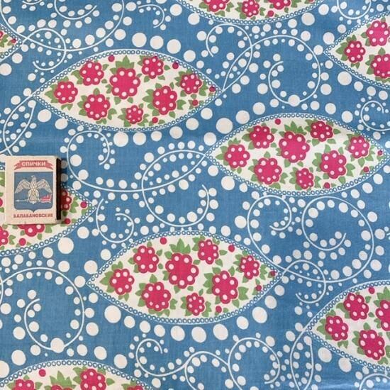 :47: 幅78cm×50cmカット 『ピンクの花』 水色系ロシアの昔の布 デッドストック ソビエトデザイン