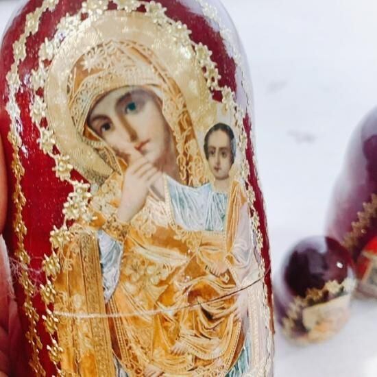 こちらのマトリョーシカは、イコンのプリント貼られ、装飾、仕上げをしてあります。