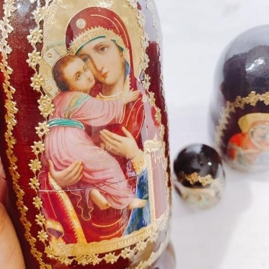 こちらのマトリョーシカは、イコンのプリント貼られ、装飾、仕上げをしてあります。