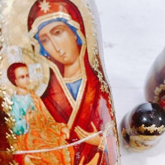 こちらのマトリョーシカは、イコンのプリント貼られ、装飾、仕上げをしてあります。