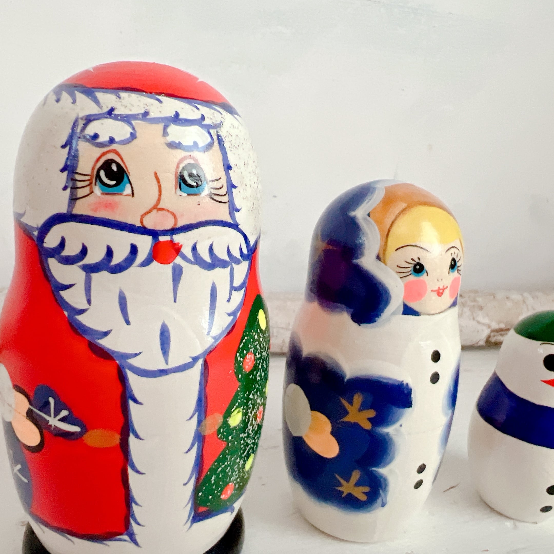 サンタさん、雪娘、そして雪だるまがそろった、愛らしい3人組のマトリョーシカです。
