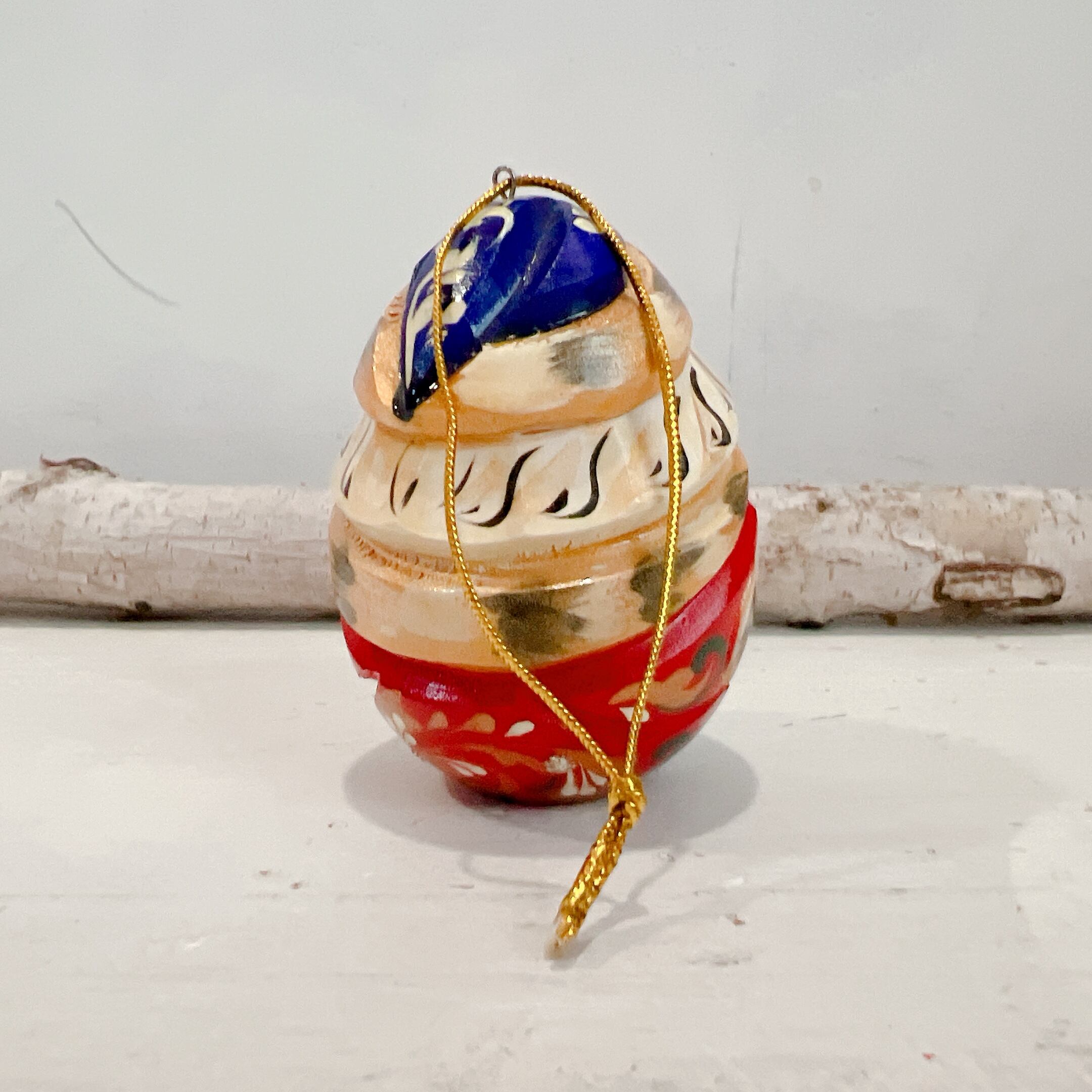 鮮やかな赤と青の彩色が目を引く、木製のサンタクロース・オーナメントです。