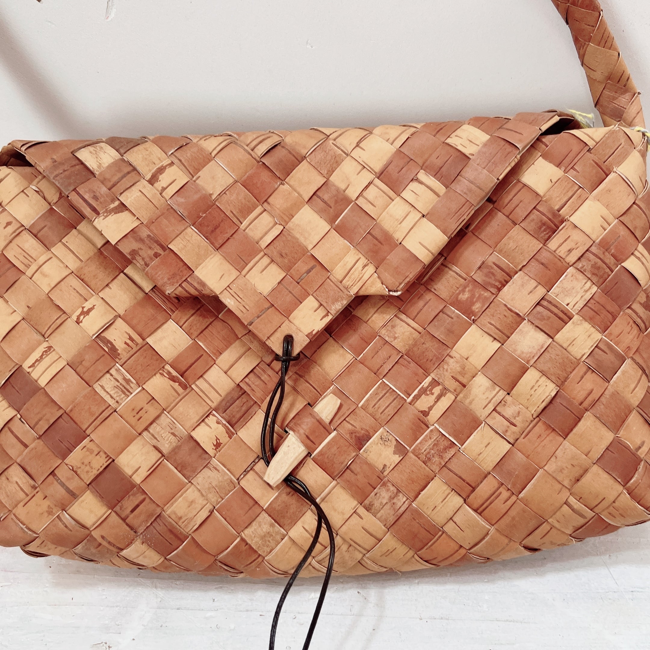 しっかりと編み込まれたカバン・・・白樺表皮を綺麗になめしてあり、切り込み幅は1.5cmです。