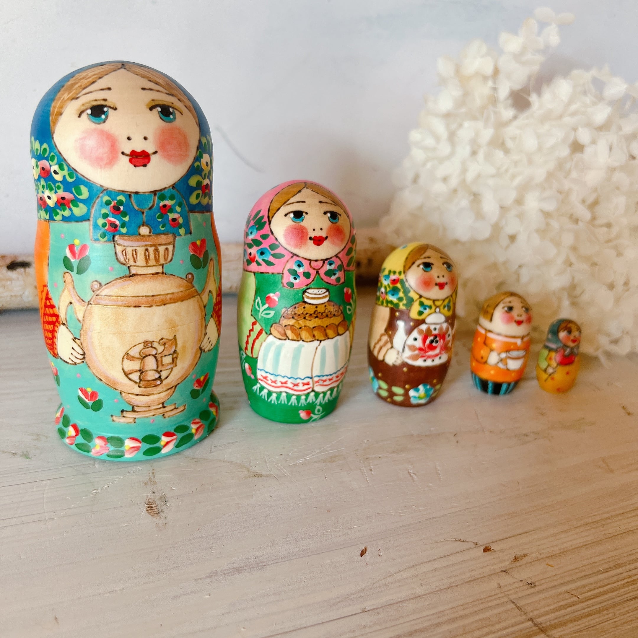 5P リューバ作 マトリョーシカ 「サモワール 青いプラトーク」 11.5cm MTRy001